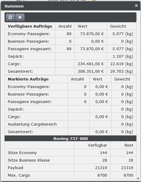 Calling the order planning also opens the totals window, which should help the pilot to select the right number of passengers or a suitable amount of cargo from the beginning. The window consists of two tables. The upper table shows the number and value of available or filtered out orders. In the lower table, only the number and value of the currently selected orders are added together.